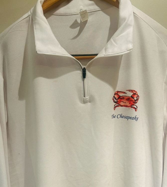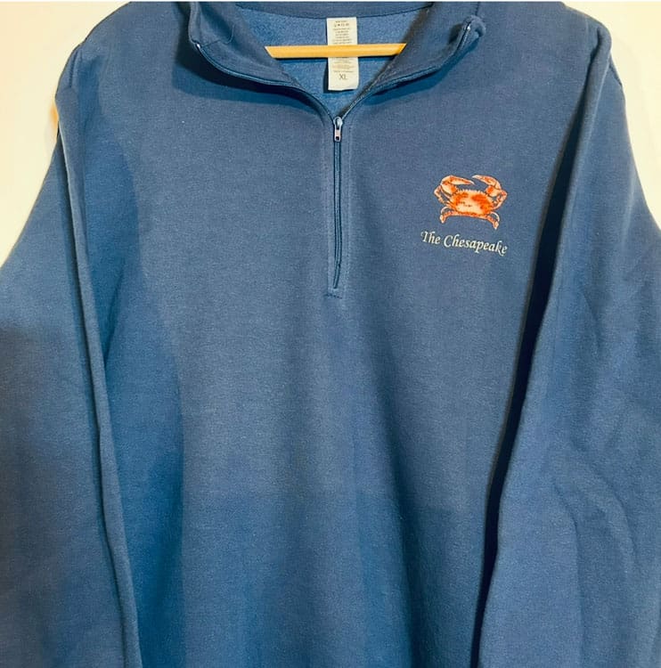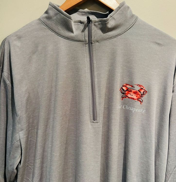 Quarter Zip Sweats featuring the Maryland crab on the front pocket, available in sizes small, medium, large, X-large, XX-large.